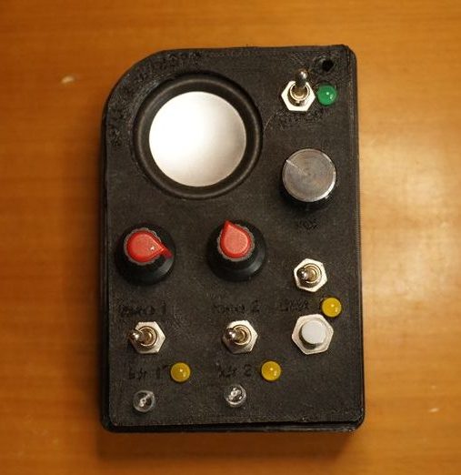Una specie di sintetizzatore analogico che produce suoni a dir poco fastidiosi basato su due circuiti integrati 555. Questa versione permette di controllare la modulazione del suono sia con i 2 potenziometri che tramite 2 foto resistenze, quindi in base alla luce ricevuta. Inoltre il segnale può essere sia continuo che ad impulso grazie ad un interruttore specifico attivabile a piacimento, ed il volume è regolabile. Anche in questo caso la costruzione interna rivela un po di confusione nella gestione dei cablaggi fronte retro, ma anche questo è uno dei primi prototipi realizzati che usasse un pannello frontale per il controllo.