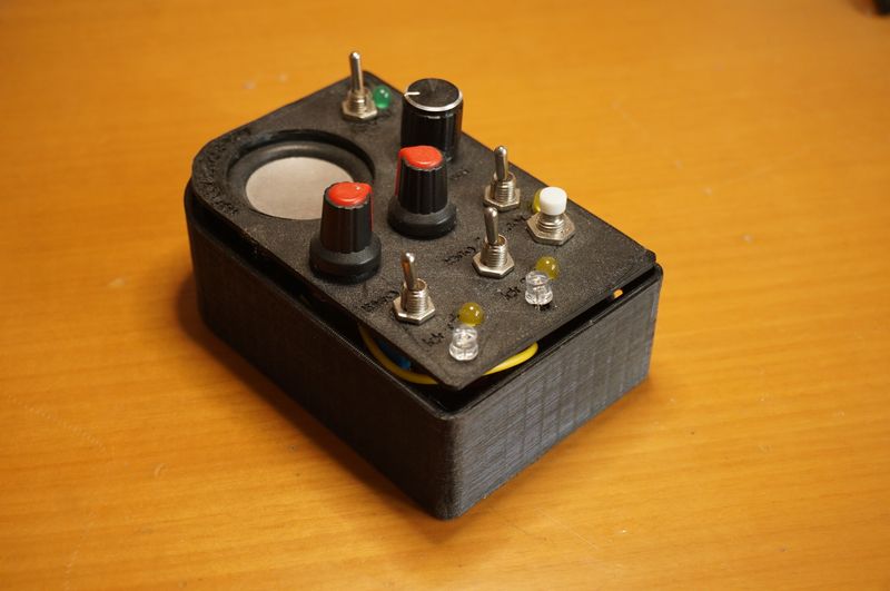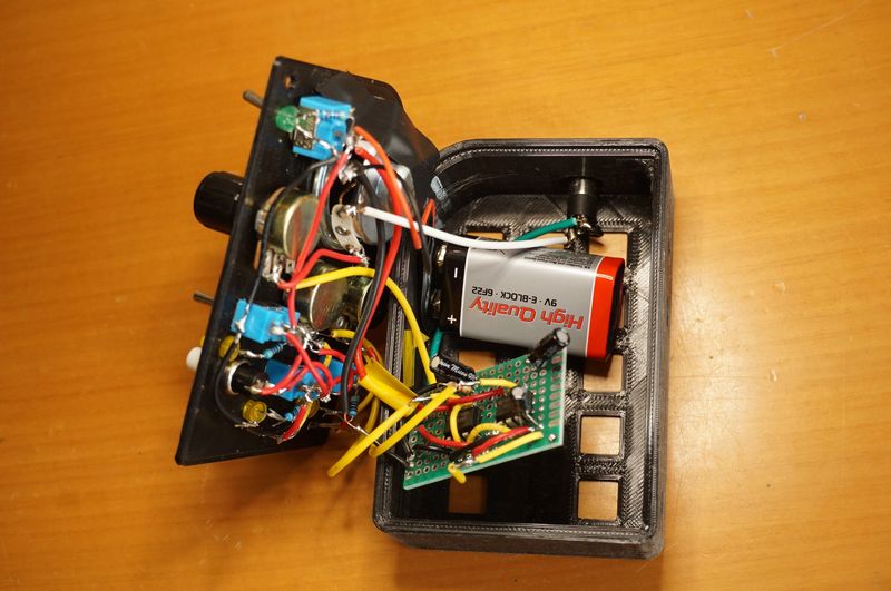 L’involucro esterno è composto da 2 elementi ad incastro. La parte inferiore ospita la batteria e la basetta millefori su cui sono saldati gli integrati ed i vari resistori e condensatori. La parte superiore invece è stata modellata posizionando i fori per ospitare tutti i componenti da regolare per modulare il suono