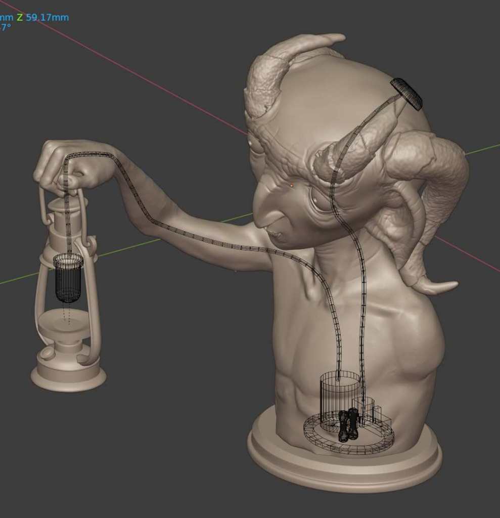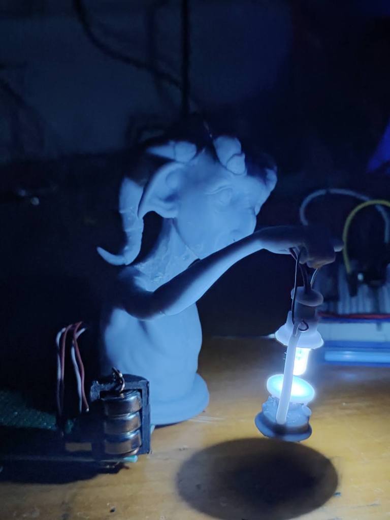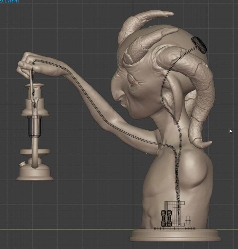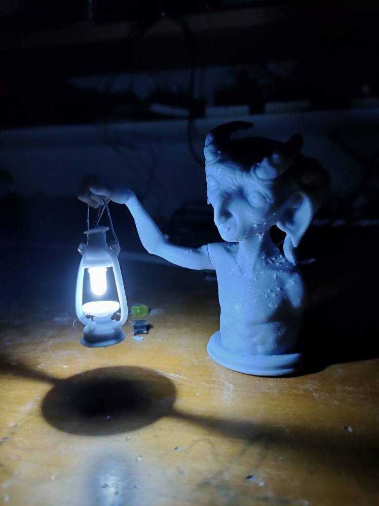 Sembrava che il modello fosse finito, ed invece viene fuori l’idea di fargli afferrare una lampada ad olio e farlo diventare una vera lampada da tavola.