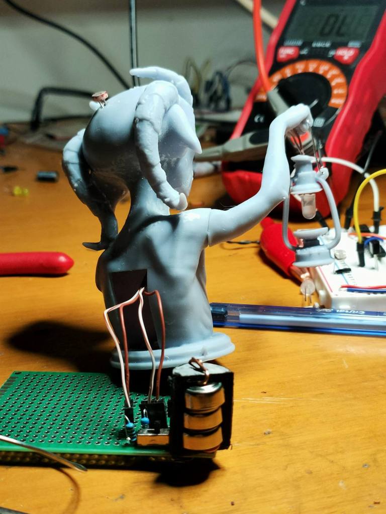 Batteria, interruttore e altri elementi elettronici andranno nel corpo, da li dei collegamenti dovranno raggiundere il led nella lampada passando nel braccio, e altri cavi dovranno raggiungere il foto resistore che ho messo dietro la testa, in modo che non si veda ma che riceva comunque bene la luce ambientale.